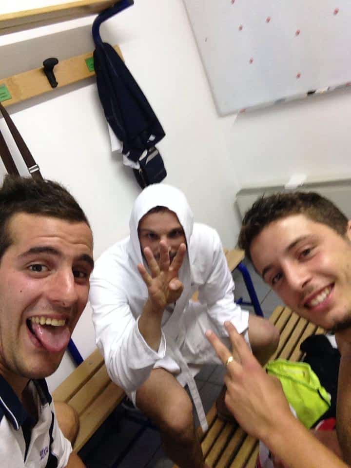 Angelo Dionisio non è un nuotatore che ha appena vinto la staffetta 4 x 100. L’accappattaoio potrebbe trarre in inganno. Supportato dai compagni Lestuzzi e Cisotti, il bomber viola riocrda il suo poker nella partita contro la Moggese. In attesa della finale di Coppa, occhio, Ovarese, perchè in questo momento Angelo è una specie di re Mida che trasforma in … gol ogni pallone che tocca!